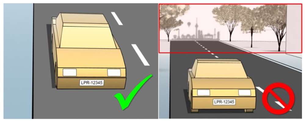 Sind zu viele irrelevante Elemente im Bild, beeinträchtigen sie die Erkennung und der LPR-Server nutzt die CPURessourcen zur Analyse irrelevanter Elemente statt von Nummernschildern.