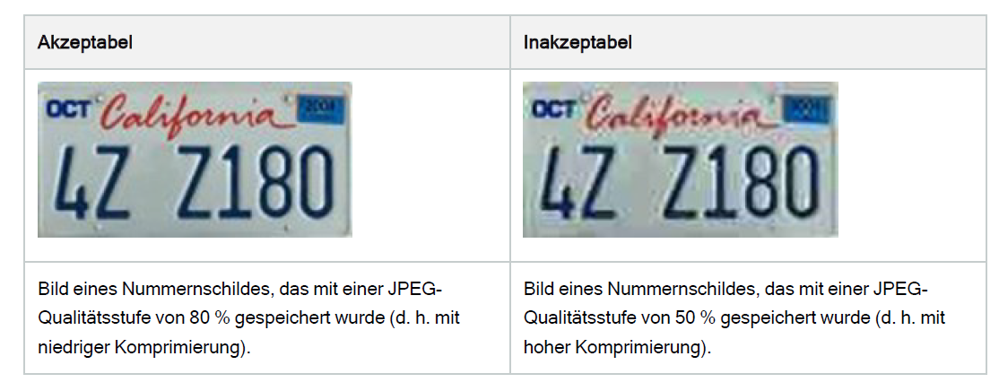 Hohe Komprimierungsraten können sich negativ auf die Qualität der Bilder von Nummernschildern auswirken. Bei