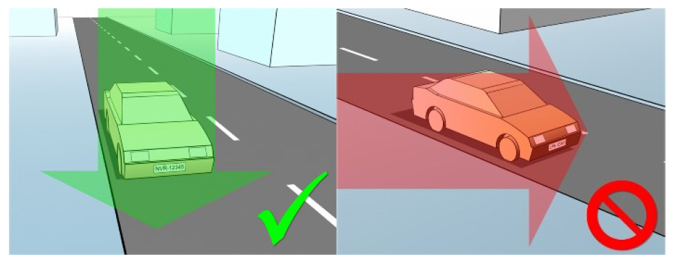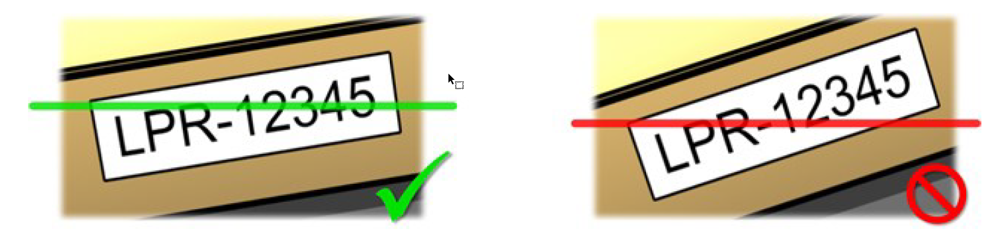 Montieren Sie die Kamera so, dass Sie eine horizontale Linie ziehen können, die sich in den erfassten Bildern über die linke und rechte Kante des Nummernschildes erstreckt. In den folgenden Abbildungen sind korrekte und falsche Winkel zur Erkennung dargestellt.
