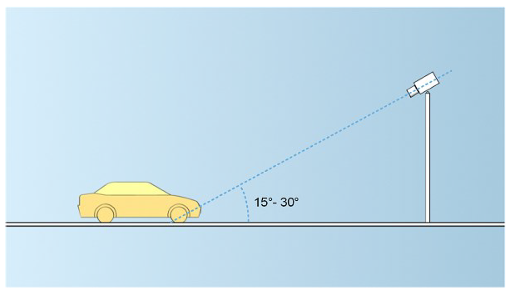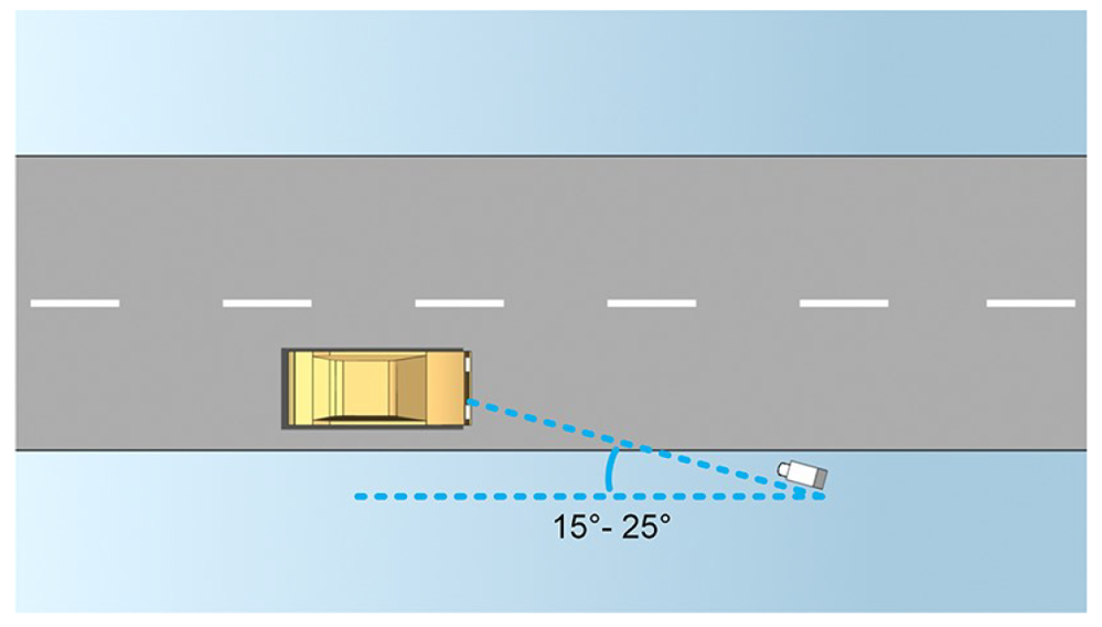 - Blickwinkel - Achten Sie darauf, dass die Kamera so positioniert ist, dass sie sich dem Fahrzeug nähert und einen horizontalen Blickwinkel von 15-25 Grad und einen vertikalen Blickwinkel von 15-30 Grad hat.