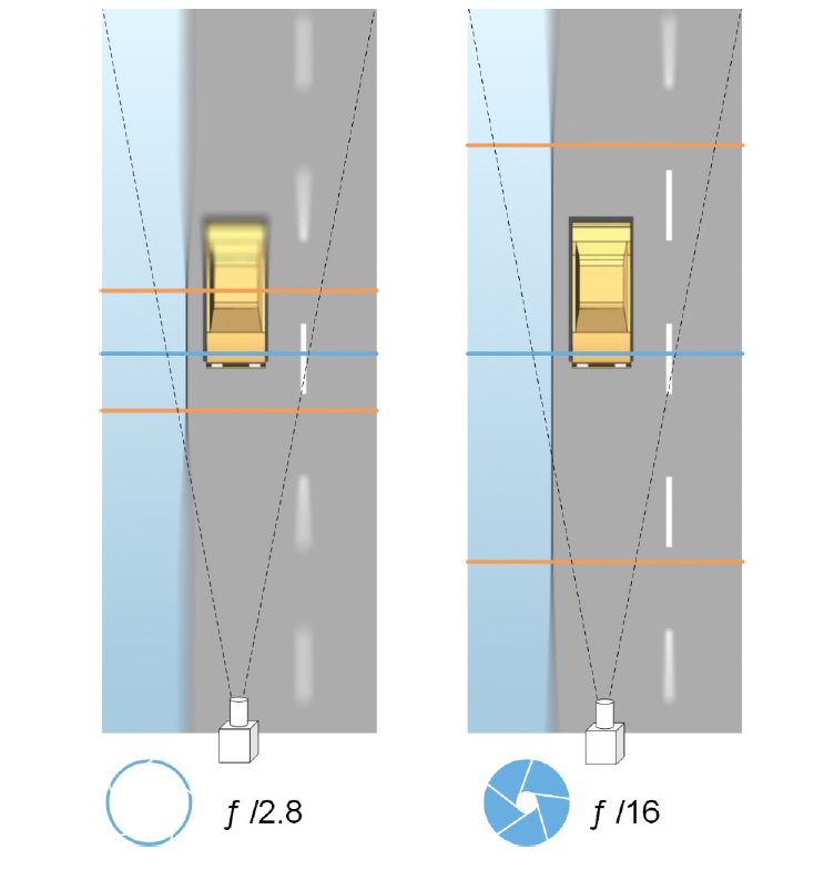 Ein niedriger Blendenwert reduziert den Fokusbereich und somit den Bereich zur Erkennung, eignet sich jedoch bei Verhältnissen mit schwachem Licht. Kann sichergestellt werden, dass die Fahrzeuge den Fokusbereich langsam durchfahren, ist ein niedriger Blendenwert für eine konstante Erkennung geeignet.