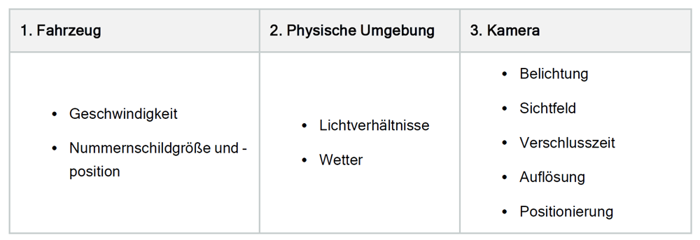- Fahrzeuggeschwindigkeit: Wenn sich Fahrzeuge bewegen, sollte die Verschlusszeit der Kameras kurz genug sein, um eine Bewegungsunschärfe zu vermeiden.