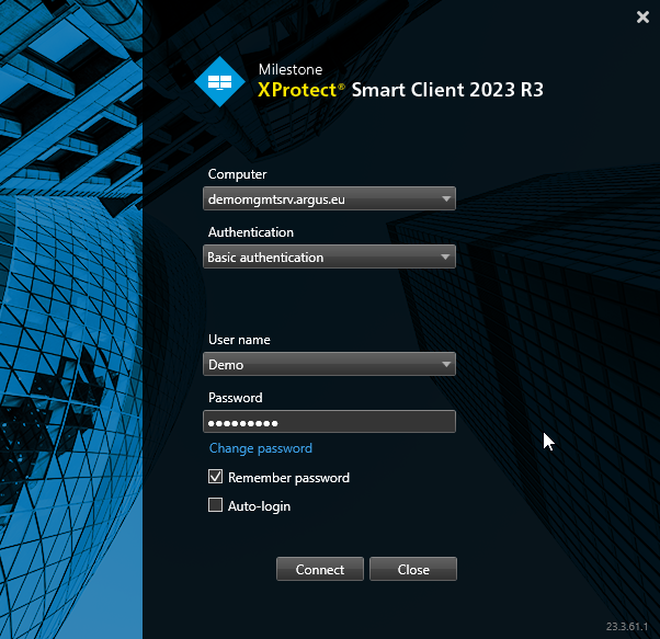 - Before you start, make sure you have the latest XProtect Smart Client 64 Bit and have installed the hotfix on your computer. Contact us if you do not yet have an account with Milestone and to receive the login information (username and password) for the Argus Demo Server: support(at)argus.eu