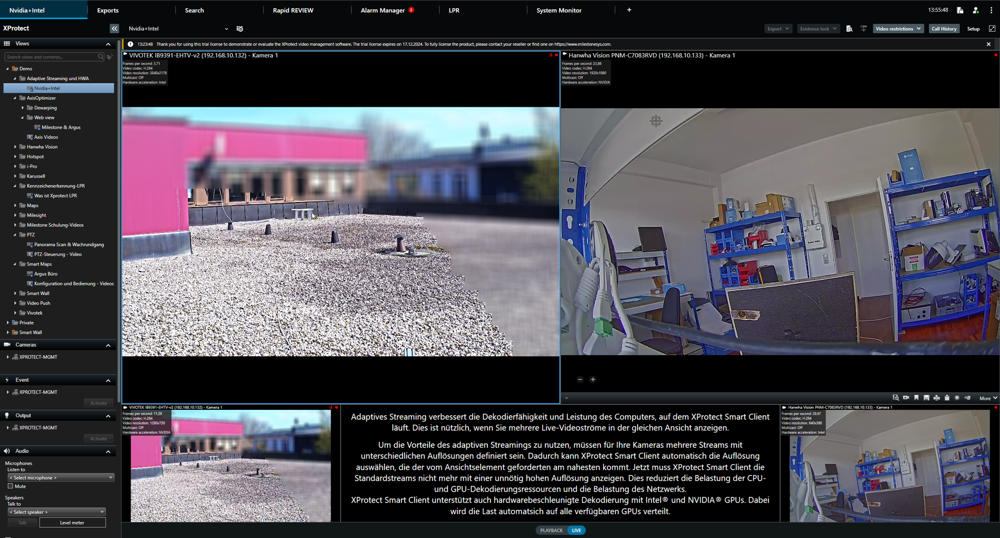 XProtect Smart Client supports hardware-accelerated decoding with Intel® (left, Vivotek camera) and NVIDIA® GPUs (right, Hanwha camera) simultaneously and automatically distributes the load across all available GPUs on the client machine.